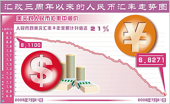圖:匯改3年 人民幣對(duì)美元升值幅度已超過(guò)21% 圖片來(lái)源:錢江晚報(bào)