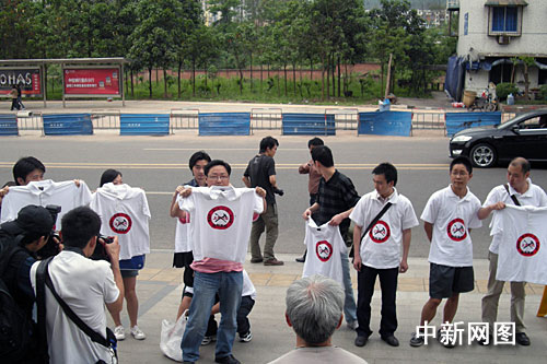 中新網重慶4月17日電 (銀雪 郭虹)17日,重慶市物價局舉行改革主城區(qū)公交票價聽證會,倍受當地市民關注。聽證會結束時,一群重慶市民在會場外身穿或手舉反公交漲價T恤,反對公交車票價上漲。