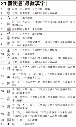 中新網(wǎng)10月22日電 身為中國人,就應(yīng)該懂中文字,你又認(rèn)得幾多個(gè)?據(jù)香港明報(bào)報(bào)道,有網(wǎng)民在網(wǎng)上搞“最難漢字”評選活動,選出21個(gè)一般人不認(rèn)識的生字候選,個(gè)個(gè)令人摸不著頭腦。