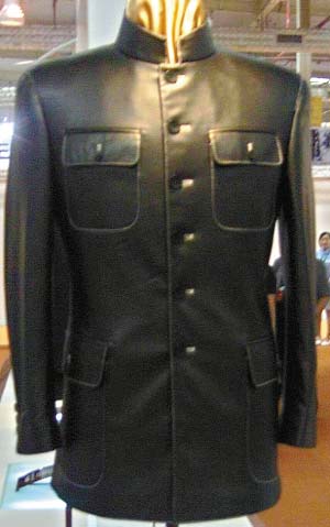 昨天下午,記者現場看到,該展區(qū)的中山裝除了傳統(tǒng)的老款式外,還包括了很多新穎的款式,例如,用香云紗、皮料制作的中山裝,用意大利進口面料制作的中山裝……