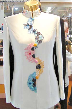有一款中山裝制作最為新潮,衣領圖案是奧運五環(huán),前襟圖案則是一條飛龍,如果仔細觀察可以發(fā)現,該條飛龍是用類似奧運福娃的局部圖案巧妙地拼接而成的。