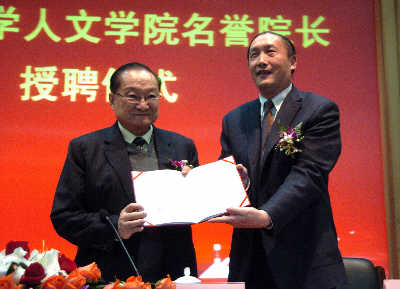 筆挺的黑西裝,黑亮的頭發(fā)整齊地后梳,昨日,83歲的金庸,氣定神閑地出現(xiàn)在浙江大學(xué)紫金港校區(qū)。雖然金庸口齒有些不清,走路也需要人攙扶,但絲毫不影響散發(fā)的英氣。他接過(guò)浙江大學(xué)校長(zhǎng)楊衛(wèi)遞過(guò)的“名譽(yù)院長(zhǎng)”聘書(shū)那一瞬間,意味著他正式卸任了浙大人文學(xué)院院長(zhǎng),可以靜心在英國(guó)讀書(shū),并有望在未來(lái)的兩年內(nèi)拿到“貨真價(jià)實(shí)”的英國(guó)劍橋大學(xué)歷史學(xué)博士學(xué)位。