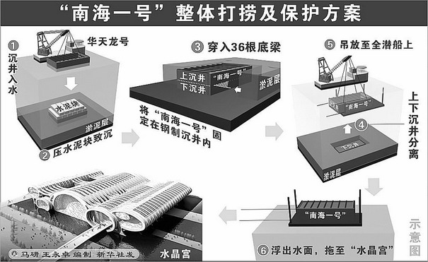 魏峻說,由于“南海一號”所在海域的海水能見度幾乎為零,水太深,采用傳統(tǒng)的水下考古方法,將無法對沉船和船載文物進(jìn)行準(zhǔn)確的測繪和記錄,必然會造成不少珍貴文物考古信息的丟失。古沉船在水下浸泡了800多年,船體非常脆弱,即使船載文物全部打撈出水,對于沉船本身的水下考古打撈也將會是一件非常困難的工作。因此,經(jīng)多方面專家的反復(fù)論證和研究,決定對“南海一號”沉船進(jìn)行整體打撈:將沉船、載物與其周圍泥沙按照原狀固定在特殊的鋼制沉箱內(nèi),將分散、易碎的文物一體化、一次性吊浮起運(yùn),然后遷移到能人為控制環(huán)境、保護(hù)較好的“水晶宮”中進(jìn)行科學(xué)的水下考古發(fā)掘。