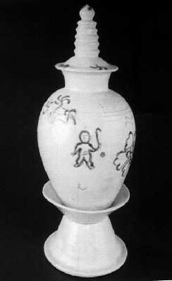 出土的兩件唐代青花塔形罐在同一墓室中,形狀相同,由蓋、罐、底座三部分組成,白瓷胎。器蓋呈塔剎狀,剎座為一覆碟剎身。一罐身飾“童子打曲棍球”、牡丹圖案,另一罐上則飾有萬字符等紋樣。罐身所繪“曲棍球”圖案引人注目,圖案中的人物叉腿而立,右腿微曲,左手揚彎形球桿,左側(cè)有一圓球,形象生動。