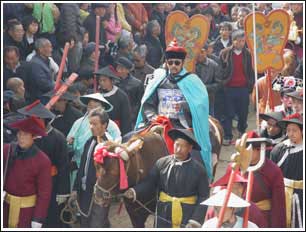 為了迎接身穿清朝官服、嘴角邊耷拉著兩撇長(zhǎng)胡須、帶著圓餅狀墨鏡的主角——“牛老爺”,村民們?cè)缭缇兔钇饋?lái)。這次耍社火,主角“牛老爺”可是從全村人中按照德貌雙全的標(biāo)準(zhǔn)篩選出來(lái)的。“牛老爺”穿靴戴帽掛官服,裝扮成清朝官員,還騎頭大黃牛,煞是威風(fēng)。