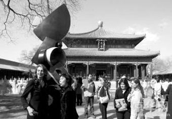 昨天,希臘著名畫家、雕塑家索菲亞·瓦瑞當(dāng)代藝術(shù)展在孔廟舉行。索菲亞·瓦瑞說,她第一次看到孔廟的照片時(shí),覺得“這樣莊嚴(yán)得讓人恐懼的地方,也許不適合展出現(xiàn)代風(fēng)格的雕塑作品”。但當(dāng)她真正踏入孔廟的時(shí)候,覺得這建筑如此“神圣而神秘”,“似乎有圣人守護(hù)我的作品”,于是,索菲亞·瓦瑞把她在過去15年中創(chuàng)作的7件青銅作品和15幅油畫作品,陳列在剛剛修繕完畢的孔廟展出。孔廟國子監(jiān)管理處馬法柱主任說:“這是孔廟首次舉辦這樣的當(dāng)代藝術(shù)展。”展覽持續(xù)到4月20日結(jié)束。(記者 趙楠楠 蒲東峰 攝)