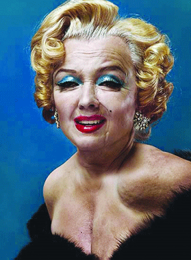 上世紀(jì)50年代的性感女神瑪麗蓮·夢露1962年去世時年僅36歲,如果她活到現(xiàn)在,將有82歲。她同樣也難逃“時間之斧”的摧殘。照片中的她皮膚松弛,滿臉皺紋。不過,或許由于曾施行了整容手術(shù),在涂抹了濃厚的唇膏和藍色眼影之后,夢露的微笑依然能找到當(dāng)年性感痕跡。然而,由于老年夢露身體已經(jīng)明顯皺縮,她身上那件時髦的緊身低胸禮服顯然已不合尺寸,仿佛隨時都有掉下來的可能。
