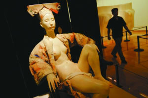 昨日,在第三屆中國北京國際美術(shù)雙年展上,一尊私處遮著白方巾的半裸慈禧雕塑,引起不少觀眾注意。雕塑作者李象群稱,該雕塑本無此“遮羞布”,是主辦方稱有觀眾舉報(bào),才將雕塑私處遮蓋。