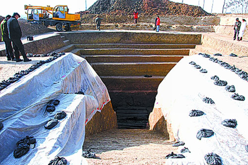 最大古墓發(fā)掘現(xiàn)場,厚厚的土層已被分成了7級(jí)收縮臺(tái)階。據(jù)介紹,這個(gè)大墓地下部分深達(dá)7米多,外開口占地面積達(dá)52平方米,墓道面積達(dá)22平方米。記者發(fā)現(xiàn),大墓最后3級(jí)臺(tái)階下,土層由黃變赭紅。專家稱,赭紅色土層其實(shí)不是真正的土層,而是尚未完全形成的紅砂巖,遇水比較軟,但風(fēng)干后就成了風(fēng)化石。因此可以想象,當(dāng)年修墓時(shí),棺槨下部的空間是由人工開鑿出來的,四壁上仍能看到明顯的開鑿痕跡。