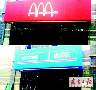 于是,肯德基的遠房表弟“啃他雞”、康師傅的老鄉(xiāng)“康帥博”、王老吉的弟弟“王老古”、中國石油的近鄰“中圍石油”……紛紛被網(wǎng)民貼圖曝光。繼而,又有南京網(wǎng)民發(fā)現(xiàn)這些高仿品牌在某地特別集中,遂有山寨店一條街。
