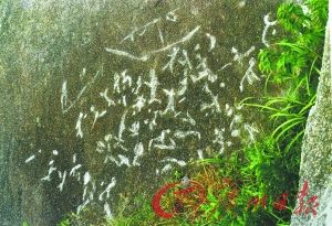 由于油港的開(kāi)發(fā)建設(shè),位于沙灘上的“天才石”巖畫、“寶鏡石”巖畫早已不見(jiàn)蹤影。大坪石巖畫位于藏寶洞附近,但記者所見(jiàn)已是風(fēng)化得可憐,不仔細(xì)察看,它和普通的石頭沒(méi)太大區(qū)別。