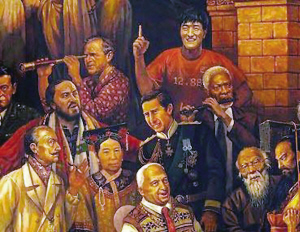 這幅畫可謂讓網(wǎng)友們開了眼,從來沒見過誰把如此眾多中外知名人物畫在一幅畫面中的,更何況還把這些名人們拼接得如此妙趣橫生、天衣無縫,大有天下大同之感?植婪肿永蔷驼驹诓际采砗,成吉思汗和拿破侖并駕齊驅(qū),搖滾明星崔健站在慷慨激昂的列寧身后,而他旁邊就是手拿書卷的希臘行吟詩人荷馬,而亞里士多德的手正扶在比爾·蓋茨的肩上,比爾·蓋茨身前是球王貝利,就在他的旁邊,手拿大刀的關(guān)云長和希特勒一起在聆聽貝多芬的琴聲,不遠(yuǎn)處雷鋒叔叔帶著他熟悉的笑容望向畫面之外,而在畫面中央的圓桌旁,斯大林和達(dá)·芬奇則比鄰而坐,毛澤東和林肯促膝而談……簡直就是一幅世界名人的全家福。