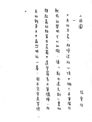 這兩個(gè)月我一直在忙著寫長篇小說《小團(tuán)圓》,從前的稿子完全不能用,F(xiàn)在寫了一半。這篇沒有礙語! 我在《小團(tuán)圓》里講到自己也很不客氣,這種地方總是自己來揭發(fā)的好。當(dāng)然也并不是否定自己。
