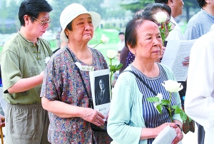 一個(gè)月前央視播音員羅京也是在這里與人們告別,和當(dāng)時(shí)的喧鬧相比,山尊老師的追悼會(huì)簡(jiǎn)單安靜,前來(lái)悼念的大約有三四百人,簽到臺(tái)上厚厚的兩摞訃告和生平簡(jiǎn)介只發(fā)出去了一半左右。悼念的隊(duì)伍里主要都是白發(fā)老人,很少能看見(jiàn)年輕人,這些人都是歐陽(yáng)山尊藝術(shù)界的老朋友。曾與他一起在人藝共事的金雅琴回憶說(shuō),山尊熱情直爽、平易近人,可是在工作上誰(shuí)要做不好,他的脾氣就大。歐陽(yáng)山尊在中戲任教時(shí)惟一帶過(guò)的班級(jí),59級(jí)導(dǎo)演專(zhuān)業(yè)的學(xué)生、著名導(dǎo)演曹其敬、白世本也來(lái)送恩師最后一程。
