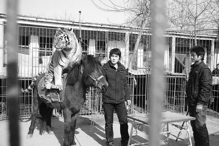 梅正川說,梅莊人馴虎已有近百年歷史。清朝末,有梅莊人開始以街頭現(xiàn)場馴獸表演為生,時間久了仿效者增多,平庸的表演已難以維持生計,一些人開始引入東北虎表演,贏得了市場,并摸索出一套獨特的馴虎方法。