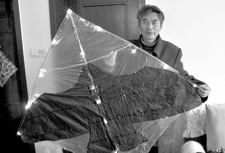 昨日下午2時許,在東坡路靠近清水河的一塊空地上,一只黑色的風箏正在天空中翱翔。在不遠處,一位身著黑衣的白發(fā)老人正拿著絞盤,不斷地放線收線,其他幾位老人則抬著頭議論紛紛。放風箏的老人名叫戚勉休,今年69歲,而他就是前晚放飛發(fā)光風箏的人。