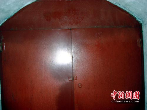 日前,記者聽說少林寺在建造一座地宮,便前往一探究竟。這座傳說的人造地宮,位于塔林西側約50米處,門口由青石砌成。地宮的石門不大,高約1米,寬約0.8米,被一把銅鎖鎖住。通過石門約5公分的門縫往里看,只能看到里面漆黑一片。當記者用卡片相機伸進石門門縫拍攝時,里面又是一扇紅色的鐵門,右側的墻壁上還安裝有電源開關。