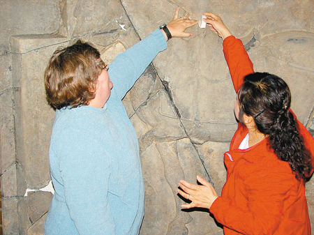 賓夕法尼亞大學(xué)博物館首席文物保護(hù)專家琳·格蘭特女士這兩天很興奮,一是中國(guó)文物修復(fù)專家的到來,帶來了東方文物修復(fù)理念,二是中國(guó)專家?guī)淼摹罢蚜炅E”殘塊石膏模型,竟與二駿中拳毛騧馬鞍斷裂部分非常匹配。格蘭特女士激動(dòng)地對(duì)記者說:這真是難以置信的成果,“二駿”來到美國(guó)快一百年了,它身上掉的另一塊石頭又找到,太讓人高興了。