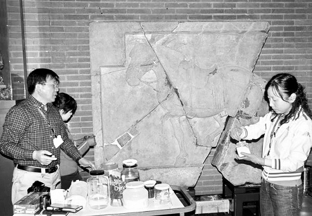 來(lái)自陜西唐大明宮遺址文物保護(hù)基金會(huì)的赴美代表和隨團(tuán)記者以及美方專(zhuān)家,共同見(jiàn)證了這一時(shí)刻。據(jù)西安專(zhuān)家組組長(zhǎng)楊文宗介紹:今天主要進(jìn)行的是補(bǔ)全工作,補(bǔ)全是文物修復(fù)工作中比較重要的環(huán)節(jié),在上一周及前期在國(guó)內(nèi)大量實(shí)驗(yàn)工作的基礎(chǔ)上,終于開(kāi)始了補(bǔ)全工作的實(shí)施。前期試驗(yàn)段主要包括修補(bǔ)材料的選擇、采用工藝的確定等工作,待實(shí)驗(yàn)結(jié)束后,中美雙方專(zhuān)家就實(shí)施方案進(jìn)行了最終的敲定。今天的補(bǔ)全工作首先是使用加固劑對(duì)斷面進(jìn)行加固,其次是調(diào)制修補(bǔ)用的填補(bǔ)材料。今日開(kāi)始,修補(bǔ)的部位主要為拳毛騧表面橫向出現(xiàn)的3條裂縫,約3.5米,颯露紫右下角、拳毛騧左下中部、左側(cè)面等幾處缺失做了填充修補(bǔ)。