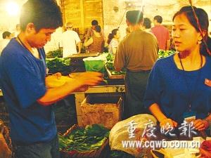昨日早上七時至下午五時,來自重慶工商大學(xué)融智學(xué)院管理系大一的八名學(xué)生,和兩位在沙區(qū)土灣模范村農(nóng)貿(mào)市場賣菜的小販互換角色10小時,體驗彼此生活。