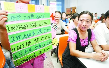 “學(xué)生的眼真毒!太嚴(yán)厲、拖堂、扔粉筆頭,好像我可以對(duì)號(hào)入座啦!”根據(jù)學(xué)生羅列的一堆毛病,一位女老師大吃一驚。“平時(shí),我真沒發(fā)現(xiàn)自己多厲害,現(xiàn)在聽你們一說,真覺得有時(shí)不該發(fā)火!倍昙(jí)語文老師樊偉說。