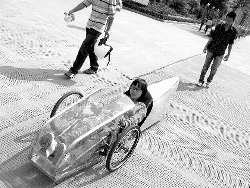 經(jīng)2個月的定型,2個月的組裝后,一個漂亮的成品汽車終于亮相了。這輛耗資2萬元,時速達(dá)100公里的小汽車車身設(shè)計呈流線型,車手只能伸直腿半臥在駕駛室里,比F1賽車的車倉還小。制造好汽車后,開始在全校選拔符合駕駛要求的車手,由于汽車屬機(jī)動車,必須持有C照以上的駕照,同時還要對車的性能很了解,而個子也需要矮小才行。最終身材嬌小的女生周卓同學(xué)脫穎而出成為了賽車手。
