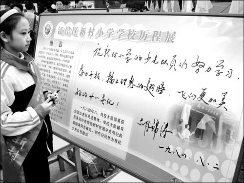 1984年8月2日,新村小學(xué)少先大隊(duì)喜獲全國(guó)少先隊(duì)先進(jìn)集體稱號(hào),該校大隊(duì)輔導(dǎo)員吳鳳玲老師受到胡錦濤的接見(jiàn)。胡錦濤欣然為該校少先隊(duì)員題詞,激勵(lì)了一代又一代少年學(xué)子。