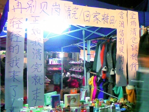 只見高高掛著的白色橫幅“再別貝崗,清完回家耕田”幾個字格外醒目,再加上“輕輕的我來了,正如我清完就走”、“含淚告別貝崗村,全場清倉跳樓價”兩幅對聯(lián)。而“靈堂”下的“祭品”卻是各種名牌護(hù)膚品。對此,不少人學(xué)生表示很迷惑:“怎么是白色對聯(lián)呀,應(yīng)該用紅色才對吧?”隔壁攤位的老板極盡挖苦地說:“好像死了一家人,等著些錢買棺材似的!倍摗办`堂”的“堂主”,竟是來自華工的高才生,“因為沒有機(jī)會外出去實習(xí),我們就通過這樣的方式來磨練自己。我們的樣子都這么慘了,大家一動心就會買的!眱蓚男生強(qiáng)調(diào),做市場營銷這一行,需要承受很多異樣的目光和心理壓力,這對他們來說是極大的鍛煉。