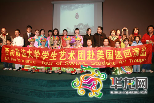 1月23日至2月6日,由西南政法大學(xué)15位表演學(xué)生、5位老師組成的學(xué)生藝術(shù)團(tuán)赴美巡演。在12天的行程里,他們輾轉(zhuǎn)美國4個(gè)州6個(gè)城市,在蒙大拿、科羅拉多、南卡羅萊納和俄亥俄等州的孔子學(xué)院及孔子課堂,共進(jìn)行5場(chǎng)演出。約有3000多名觀眾觀看了演出,每場(chǎng)演出都受到了觀眾們的熱烈歡迎。