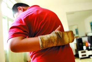 第二次受傷在5月21日。曹力強說,“那節(jié)是社會課,我在課上問了同學(xué)一個問題,教社會課的張老師朝我走過來,我當時害怕,就從座位上起身,往教室后面躲,到教室最后面,我拿掃帚擋著身體,張老師抓住我的左胳膊往后別,還掰我手指!