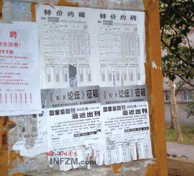 在高校里,在學(xué)術(shù)界,這已是個(gè)公開(kāi)的秘密,或者是中國(guó)式的潛規(guī)則。否則,那些“論文中介”也不可能應(yīng)運(yùn)而生。如果你把轎車停在大學(xué)門(mén)口,可能會(huì)有雪片一樣的名片塞進(jìn)車窗——“想發(fā)表論文嗎?期刊中介為你排憂解難!”而在“百度”上搜索,論文代理商的名字成百上千。