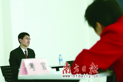 記者在現(xiàn)場看到,不少警校出來的考生都身穿警服來面試,這群“準(zhǔn)警察”在西裝革履的考生群中尤為醒目,但他們在進入考場上交手機等通訊工具時,隨即被要求把警號摘下,以免在面試過程中透露個人信息,影響考試的公平性!霸鞠M诿嬖囍汹A取一些形象分和同行分,但效果并不大!币幻忌鷮τ浾哒f。參與面試的7名考官中,只有兩名是來自公安系統(tǒng)的同行,其余5名皆是來自其他行局的考官。