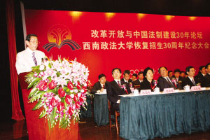 昨日,西南政法大學(xué)恢復(fù)招生30周年紀(jì)念大會召開,全國人大常委會副秘書長李連寧、國務(wù)院法制辦副主任張穹、最高人民法院副院長江必新、最高人民檢察院副檢察長朱孝清、中共重慶市委副書記張軒等出席論壇。幾位副部級以上高官盡管職務(wù)不同,但都喜歡把自己稱為西政人。