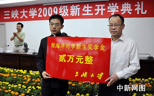 開(kāi)學(xué)典禮上,三峽大學(xué)校長(zhǎng)李建林為5名新生頒發(fā)錄取通知書,三峽大學(xué)黨委副書記何偉軍為周海洋頒發(fā)了2萬(wàn)元新生獎(jiǎng)學(xué)金。隨后,周海洋作為新生代表發(fā)言,他說(shuō),自己是懷著感恩的心態(tài)進(jìn)入三峽大學(xué)的,站在新的人生起點(diǎn),他最大的希望是4年內(nèi)學(xué)有所成,以此報(bào)答學(xué)校的培養(yǎng)和家人的厚望。周海洋的發(fā)言不似他的文章那般酣暢淋漓,而是顯得有點(diǎn)語(yǔ)無(wú)倫次,他多次表示是由于太激動(dòng)的緣故。