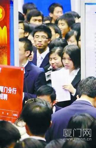 當(dāng)日在廈大召開的畢業(yè)生招聘會(huì),是廈大每年為自己的畢業(yè)生舉辦的,不過,幾乎省內(nèi)的大學(xué)都有人趕去參加,使得廈大這一年一度的招聘會(huì)首次實(shí)行門禁——依照人流量分時(shí)段放人入場,有的畢業(yè)生花了一小時(shí)才遞上一份簡歷。