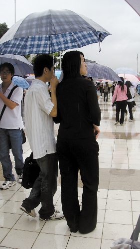 “好煩,早知道下雨就不來了,討厭!”為給面試官好印象,女大學(xué)生丹丹特地選了一套淺色條紋的套裝。但恰逢招聘會(huì)當(dāng)天是下雨天,丹丹的小套裝一下就粘上了點(diǎn)點(diǎn)雨花。丹丹一邊整理,一邊對(duì)身旁負(fù)責(zé)撐傘的男友撒嬌,而男友則不厭其煩地細(xì)語安慰:“忍一下就好,快到你了……”