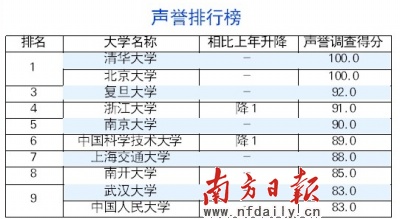 雖然清華和北大的地位難以撼動(dòng),但在綜合榜單中,第三到第十名的位置還是處于一種“動(dòng)態(tài)的平衡”中,去年排名第五的浙江大學(xué)超越了南京大學(xué)和復(fù)旦大學(xué),躍居第三,中國(guó)科學(xué)技術(shù)大學(xué)、南京大學(xué)、復(fù)旦大學(xué)、上海交通大學(xué)、北京師范大學(xué)、哈爾濱工業(yè)大學(xué)、南開(kāi)大學(xué)、中國(guó)人民大學(xué)(含并列)依次排名第四至第十。去年排名第十的中山大學(xué)今年排名第18。