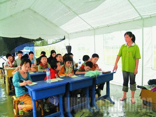 一位村民特意將學(xué)校的情況拍下來(lái)發(fā)到網(wǎng)上,吁請(qǐng)社會(huì)各界關(guān)心和支助。陸續(xù)有人送來(lái)書包、課本、文具、小黑板和課外讀物。什邡圣修堂的教職人員,幫他們聯(lián)系到志愿者前來(lái)任教,附近抗災(zāi)的部隊(duì)官兵為學(xué)校搭建起一頂新帳篷。