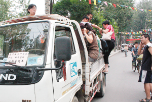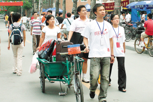 天津大學(xué)“新生報到處”所在的教學(xué)樓門前,整整齊齊地停著一排面包車、小貨車,每輛車上都貼著“迎接新生專用車”等標(biāo)志。新生登記后,高年級志愿者就會幫他們將隨身行李裝上汽車。能容納五六個人的面包車塞下行李之后,載上新生一家三口,一般就再也擠不下人了。從老師們口中得知,僅僅昨天上午,他們就在兩地往返了二三十次。