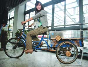 “快看,一邊蹬一邊就能洗衣服了!币惠v三輪車被參觀的學(xué)生團(tuán)團(tuán)圍住。這可不是一輛普通的車,它可是集洗衣、健身于一體的新節(jié)能“產(chǎn)品”。