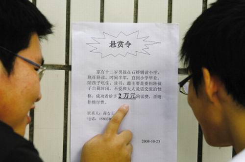 昨日中午,記者來到工商大學,在該校男生宿舍二幢樓外看到這則“懸賞令”,內(nèi)容為:“家有12歲男孩在石橋鋪某小學讀書,現(xiàn)征陪讀,時間半年,直到小學畢業(yè),陪孩子吃、住、讀書,最關(guān)鍵的是要能扭轉(zhuǎn)孩子自我封閉,不愛和大人說話交流的性格,成功者給予2萬元陪讀費,否則只付車費!
