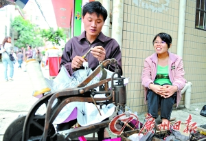 補(bǔ)鞋攤位與房子一街之隔,一張木凳,一臺(tái)機(jī)車,一個(gè)木制工具箱,這就是劉建文的謀生家當(dāng)。如今,年輕的夫婦倆每天坐在街上,妻子幫著拿東西,丈夫忙著修修補(bǔ)補(bǔ),一雙鞋3元錢,一把雨傘2元錢!艾F(xiàn)在干這行的人多了,一天賺個(gè)40元已經(jīng)很不錯(cuò)!苯ㄎ牟粺o憂慮地表示,“房租230元,兩個(gè)人只有幾百元生活費(fèi),挺難的。”