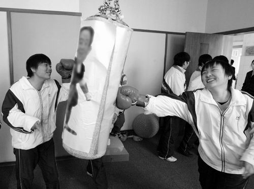 25日,記者走進(jìn)陽(yáng)光心靈驛站,黃色和藍(lán)色相間的墻面讓這個(gè)房間顯得格調(diào)平和而優(yōu)雅。驛站由陽(yáng)光工作室、心理宣泄室、心理放松室三部分組成。站內(nèi)還提供了諸如宣泄皮人、臉譜、放松球、沙袋及拳擊手套等宣泄工具,配備專業(yè)教師7名。記者注意到,該校分管學(xué)生的副校長(zhǎng)孟凡祥和3位級(jí)部主任的頭像也上了沙袋,學(xué)生們打起來毫不手軟。