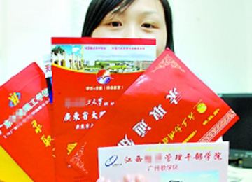 無獨有偶,在城區(qū)躍龍路44幢居住的梁靜波(化名),不久前竟然和50多歲的爸爸一起收到了來自江西某經(jīng)濟管理干部學(xué)院的“錄取通知書”。“錄取通知書”上的就讀條件非常誘人,不但可以自選專業(yè),還可實現(xiàn)專升本,而且百分百包分配,并保證學(xué)生在單位里能得到年終獎、出國深造、遷戶口、安排家屬就業(yè)等待遇。