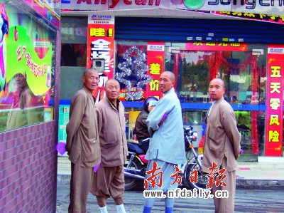 昨日上午10點(diǎn)30分,記者在丹灶街頭采訪時(shí),巧遇一群“和尚”打扮的人,他們?cè)诘ぴ畛菂^(qū)商業(yè)大街的一些店鋪或商場(chǎng)間穿梭,時(shí)而分頭行動(dòng),時(shí)而又聚在一起,行色匆忙。