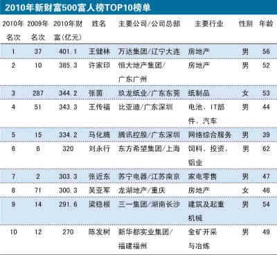 上周末,《新財富》雜志發(fā)布2010年“新財富500富人榜”,上榜富人財富總額為28756.5億元,較2009年增長76.6%。萬達(dá)集團(tuán)王健林以401.1億元位居首富;許家印以385.3億元位列第二;張茵以344.2億元位列第三。
