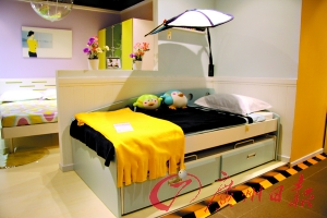 記者看到很多類似組合:高架床,床旁邊是一個(gè)小扶梯,扶梯臺(tái)階由幾個(gè)抽屜拼成,抽屜可以儲(chǔ)放衣物。床下面是一個(gè)轉(zhuǎn)角電腦學(xué)習(xí)桌,可以放置一臺(tái)電腦,又可以當(dāng)書桌使用。在電腦桌旁還放有一個(gè)小衣柜,可以放置一些常用衣物。另一轉(zhuǎn)角處有一個(gè)文件柜,可以放學(xué)習(xí)資料和書籍。電腦桌被分隔成二層,底下的一層還可以放小物件、書籍等。大約兩平方米的空間就這樣被充分利用起來(lái)了。