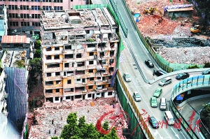 “一點不用擔(dān)心,絕對百分百安全。”現(xiàn)場負(fù)責(zé)拆除的工人張師傅介紹,因為八層樓緊貼高架橋,為保證拆樓不殃及橋體,所以決定將大樓分片拆除。一周前,工人給大樓鑿了五六道縫,鑿?fù)ǹ可系乃膶,每間房都要開口,到時再由機(jī)器用繩索從不同方向分別拽倒。張師傅說,這棟待拆的八層樓幾日后便可放倒。