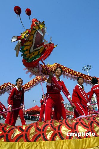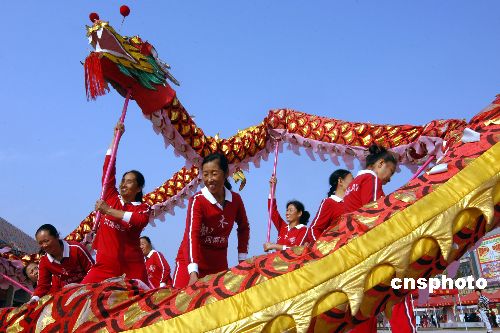 2007年10月20日,在安徽省亳州市萬福廣場,一支女子舞龍隊的隊員正在進行舞龍表演,為在這里舉行的為期兩天的亳州市首屆“萬福”老人節(jié)助興。中新社發(fā) 張延林 攝