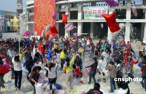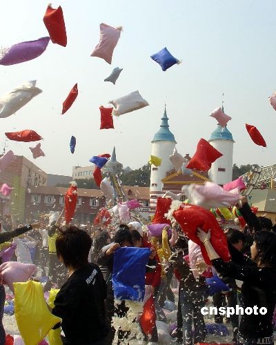 為慶祝即將到來的“三八”國際婦女節(jié),風(fēng)靡歐美的游戲“枕頭大戰(zhàn)”3月3日在長沙世界之窗再次擂響戰(zhàn)鼓,千余名女性以枕頭當(dāng)“武器”,互相投擲,發(fā)泄壓力。中新社發(fā) 肖前輝 攝